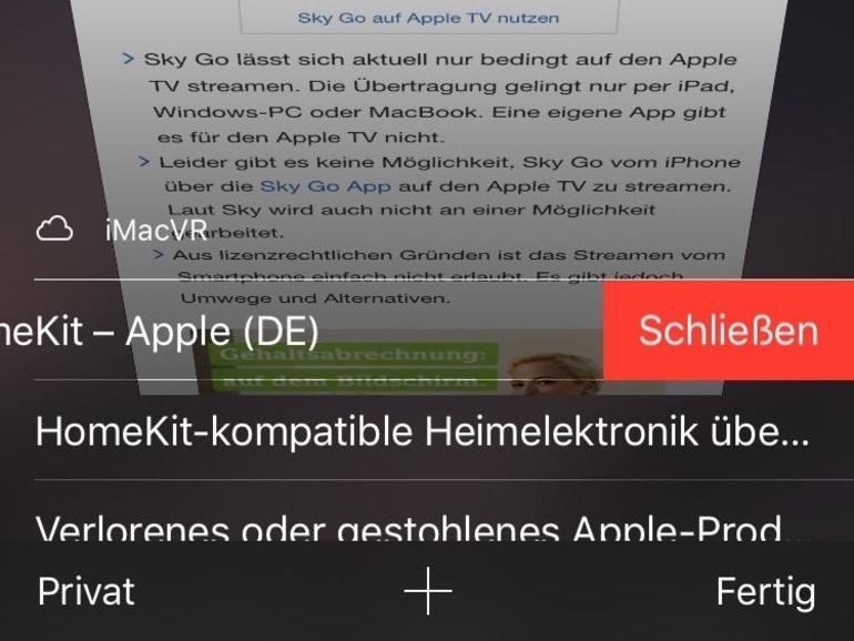 Wie bei der Desktop-Version am Mac lassen sich auch unter iOS in Safari Tabs nutzen, also mehrere geöffnete Webseiten parallel. Über die Tab-Verwaltung können Sie nicht nur die am iOS-Gerät geöffneten Tabs auswählen, sondern auch die anderer iOS-Geräte und Ihres Macs. Letztere lassen sich sogar „ferngesteuert“ löschen, einfach per Wischgeste nach links.