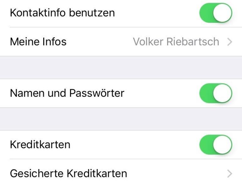 Wer auch mit iPhone und iPad online einkaufen geht, kann in den Einstellungen von Safari unter dem Punkt „Automatisch ausfüllen > Gesicherte Kreditkarten“ auch die Daten seiner Kreditkarten hinterlegen – das spart das mühsame Eintippen beim Online-Kauf. Hier sind alle Daten einzutragen, bis auf den dreistelligen Sicherheitscode, der ist bei jedem Einkauf manuell einzugeben. Der Zugang zu dem genannten Eintrag ist per Code-Sperre beziehungsweise Touch-ID gesichert.