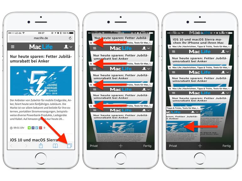 Beide Varianten funktionieren natürlich auch im Privat-Modus, der Sie surfen lässt, ohne Spuren davon auf Ihrem Gerät zu hinterlassen. Leider fehlt in iOS 9 noch die Möglichkeit sämtliche Tabs mit einem oder zwei Tipps zu löschen. Hierzu müssen Sie momentan noch mehrfach wischen oder auf das (X) neben dem Seitentitel tippen. Erst mit iOS 10 schafft Apple Abhilfe für diesen unkomfortablen Umstand.