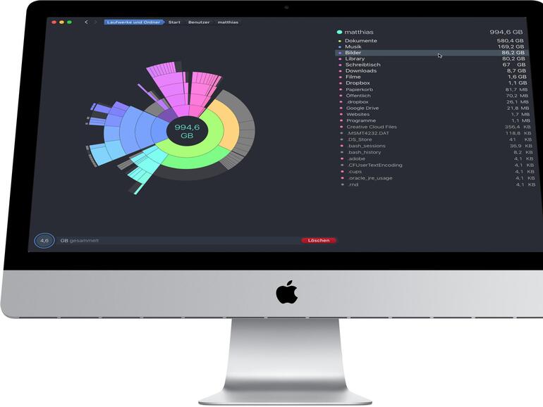 Für eine genauere Analyse benutzt du ein spezielles Tool, wie zum Beispiel DaisyDisk, das für 9,99 Euro im App Store erhältlich ist [Link in den App Store]. Es bietet eine sehr gute grafische Übersicht der Order und der darin enthaltenen Dateien, in der du auch direkt mit der Maus navigierst und Objekte löschen kannst. Die Belegung wird in Kreissegmenten dargestellt, die an die Spuren auf einer Festplatte erinnern. Dateiart und Größe werden übersichtlich durch Farbe und Fläche des Segments sichtbar. So spürt man schnell die dicken Brocken auf, da man alle Ordner auf der Festplatte relativ einfach und intuitiv durchsuchen kann. Mit GrandPerspective und Disk Inventory X gibt es auch kostenlose Alternativen, die allerdings nicht ganz die Eleganz und Effektivität von Daisy Disk bieten.