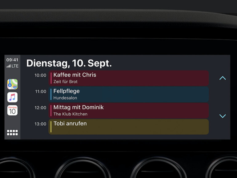 In iOS 13 erhielt auch CarPlay diverse neue Funktionen. Unter anderem spendierte Apple dem Infotainment-System die Kalender-App, damit Sie schnell und einfach kommende Termine einsehen können. Anstehende Ereignisse präsentiert Ihnen dabei das neues Dashboard. Haben Sie eine Adresse oder einen Kontakt hinterlegt, können Sie von hier aus auch die Navigationen oder einen Anruf starten. Alternativ steht Ihnen dafür auch Siri zur Seite.