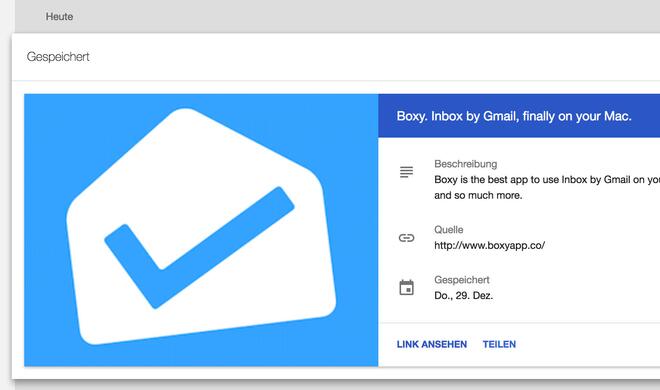 Inbox dient nicht nur als E-Mail-Programm und Aufgabenliste, sondern kann auch Webadressen verwalten. Das geht ganz einfach: Kopieren Sie die URL einer Webseite aus der Adressleiste Ihres Browsers, erscheint über dem Plus-Button in der rechten unteren Ecke von Inbox ein Verknüpfungssymbol. Klicken Sie es an, offeriert Ihnen Inbox Möglichkeiten zum Teilen und Speichern des Links. Entscheiden Sie sich für die erste Option, formuliert das Programm automatisch eine E-Mail, in die Sie nur noch den Empfänger eintragen müssen. Speichern Sie den Verweis, erzeugt Inbox einen Eintrag, von dem aus Sie die Webseite jederzeit aufrufen können. Auch Link-Einträge können Sie anpinnen.