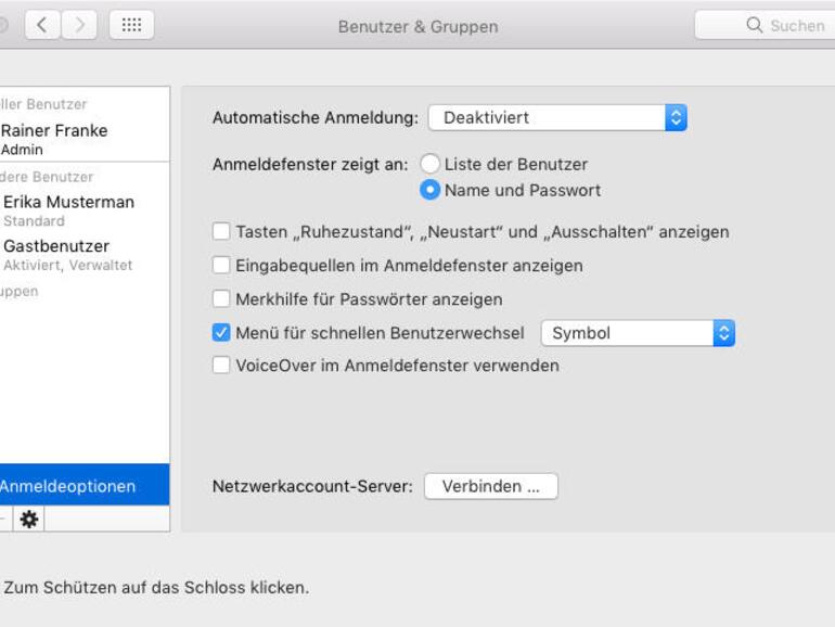 Zuerst schalten Sie in den Anmeldeoptionen in „Benutzer & Gruppen“ die automatische Anmeldung aus, am besten auch die Benutzerliste. Vorsicht: Die Merkhilfe für das Passwort hilft auch anderen beim Raten!