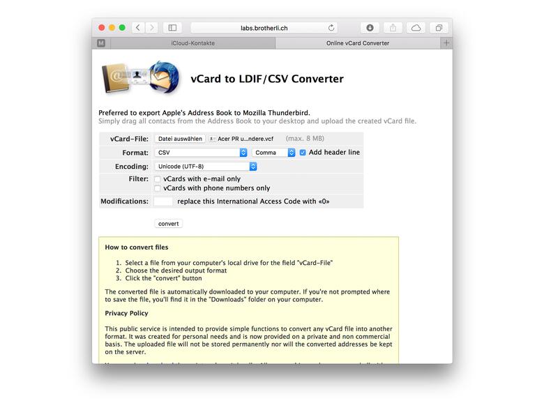 Klicken Sie jetzt auf „Alles auswählen“ und danach wieder auf das Zahnrad. Nun wählen Sie „vCard exportieren“ aus. Die VCF-Datei wird standardmäßig im Download-Ordner gespeichert. Rufen anschließend die Seite des vCard-Converters in Ihrem Browser auf. Klicken Sie auf „Choose File“ und wählen SIe die eben erstellte vCard-Datei aus. Danach sollten Sie folgende Einstellungen anwählen: