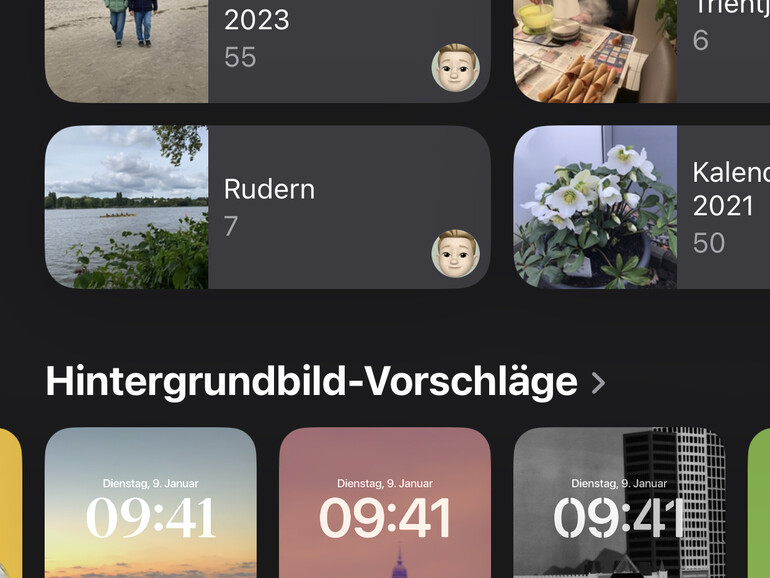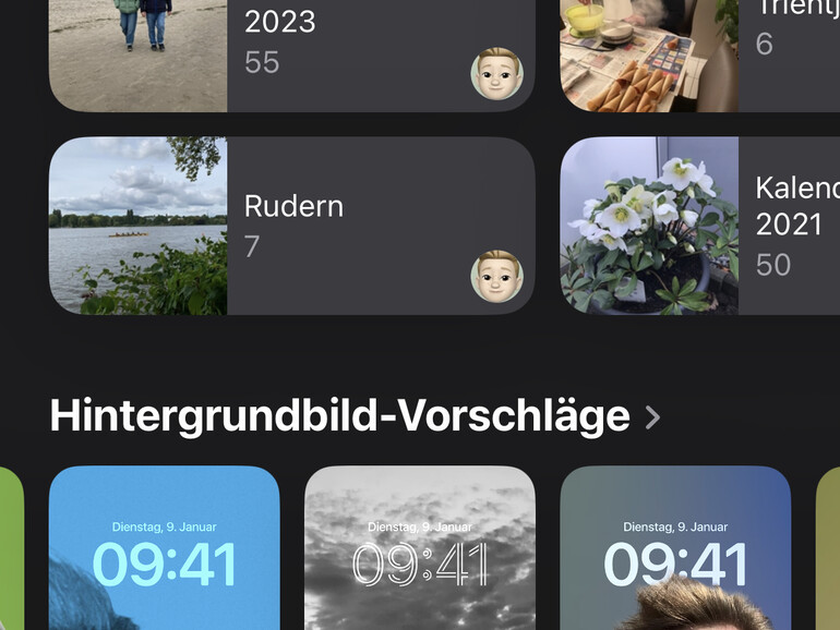 Den Abschluss der langen Fotopräsentation bildet eine neue Kategorie. Fotos wählt automatisch aus deinen Bildern Vorschläge für Bildschirmhintergründe aus. Das scheinen bevorzugt Porträts, Bauwerke und Landschaften zu sein. Fotos passt den Bildausschnitt, die Farbe und die Schrift für die Uhr auf dem Sperrbildschirm an und arrangiert alles passend. Die so erzeugten Hintergründe kannst du direkt aus Fotos heraus auswählen und installieren.