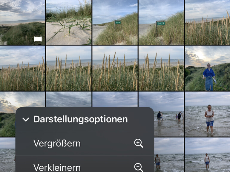 Auf den ersten Blick sieht Fotos fast wie sein Vorgänger aus, dabei hat Apple die Oberfläche komplett überarbeitet. Im oberen Bereich des Bildschirms zeigt die App nach dem Öffnen die Mediathek. Das wirkt erst einmal so wie früher. Darunter folgen allerdings direkt die verschiedenen anderen Bereiche. Es gibt keine Navigationsleiste für die Auswahl, stattdessen folgen auf die Mediathek automatisch erstellte Bereiche für die letzten Tage, Personen und Tiere, Reisen, Rückblicke und mehr. Wichtige Bereiche kannst du dir unter „Angepinnte Sammlungen“ ablegen. Alle sind auf einem langen Bildschirm angeordnet, den du einfach durchblättern kannst. Gehst du noch weiter nach unten, folgen die Auswahl einzelner Medienarten und spezielle Bereiche wie ausgeblendete Fotos, Duplikate oder die zuletzt gelöschten Bilder. Dabei sind neue Einträge wie Belege, Illustrationen, Handschrift oder QR-Codes hinzugekommen. Danach folgen deine eigenen Alben und geteilte Fotos.