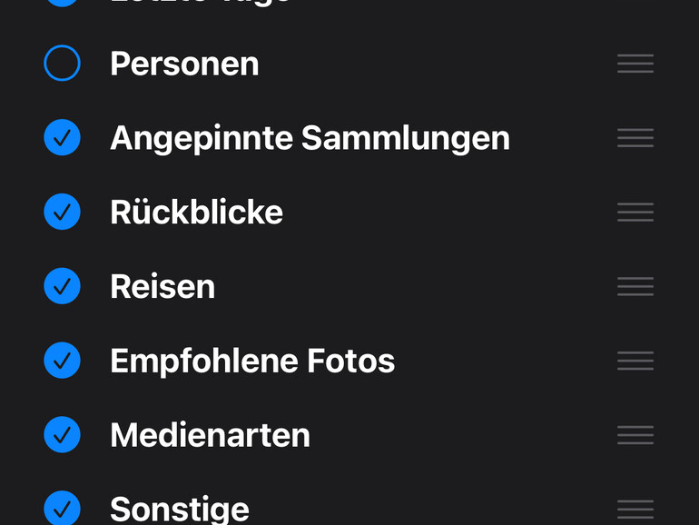 Fotos bietet mit der flachen Hierarchie nicht nur einen schnellen Zugriff auf alle Inhalte. Eine weitere Stärke der neuen Oberfläche ist, dass du sie ganz an deinen Bedarf anpassen kannst. Unter den Bildern findest du nämlich noch die Taste „Anpassen & Neuordnen“. Damit lässt sich der Inhalt der Oberfläche individuell konfigurieren. Zeigt Fotos für deinen Geschmack zu viele Inhalte, so blendest du sie einfach aus. Du kannst wählen, welche Medienarten Fotos anzeigen soll und in welcher Reihenfolge. Platziere für dich wichtige Bereiche oben, damit du sie schnell erreichst.