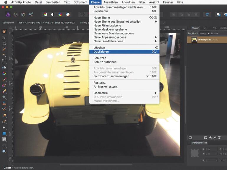 - Einstieg in die Bildbearbeitung mit Affinity Photo: Perspektivische Fehler korrigieren - Schritt 1:- Die Hintergrundebene ist geschützt und lässt sich nicht drehen, daher musst du mit einem Klick auf das Schloss-Icon den Schutz aufheben, oder – besser – dupliziere es mit [cmd] + [J].