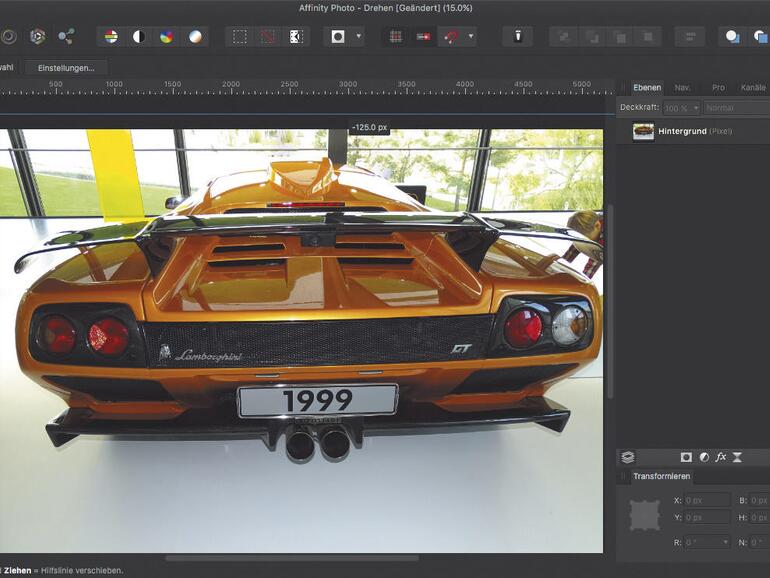 - Einstieg in die Bildbearbeitung mit Affinity Photo: Perspektivische Fehler korrigieren - Schritt 1:- Blende die Lineale mit [cmd] + [R] ein und ziehe ein paar Hilfslinien ins Bild, die dir bei der Korrektur behilflich sind. Wir konzentrieren uns im Beispiel auf die Kotflügel und die Reifen.