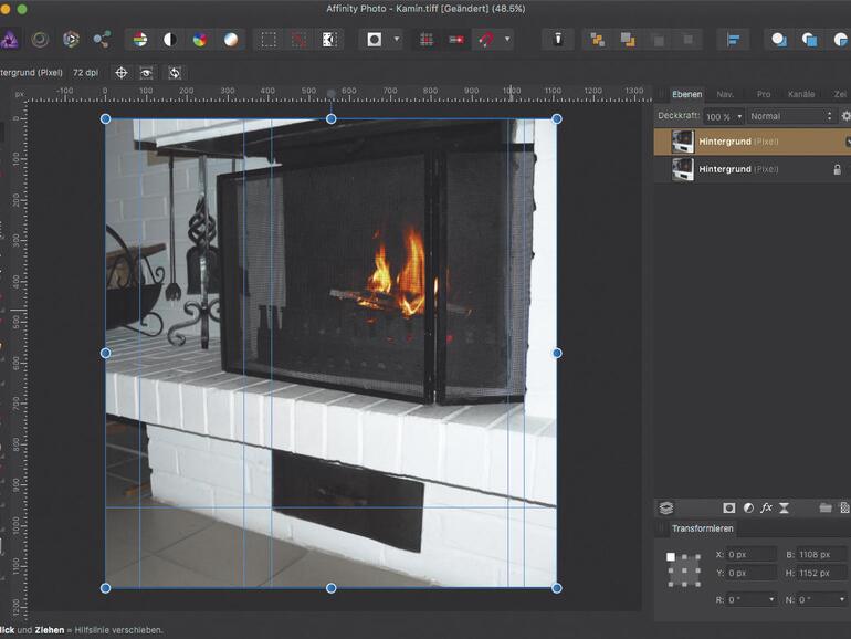 Vor dem manuellen Drehen musst du die Hintergrundebene mit [cmd] + [J] duplizieren und zum „Verschieben“-Werkzeug [V] wechseln. Die Hintergrundebene ist geschützt und kann nicht gedreht werden. Durch den Werkzeugwechsel, blendet Affinity Photo neun Ankerpunkte ein. Acht an den Bildkanten und einen etwas außerhalb. Das ist der, mit dem du das Bild drehen kannst. Alternativ kannst du den Cursor auch neben eine der Ecken bewegen. Daraufhin ändert sich die Pfeildarstellung zu einem „Pfeil-um-die-Ecke“, mit dem du ebenfalls das Bild drehen kannst. Entspricht die Darstellung deiner Vorstellung, fahre wie beim Zuschneiden-Werkzeug beschrieben fort. Benötigst du einen anderen als den Mittelpunkt als Drehachse, klicke in der Kontextleiste auf die Schaltfläche „Rotationsmittelpunkt anzeigen“. Anschließend kannst du diesen mit der Maus aus der Mitte an die gewünschte Position verschieben.