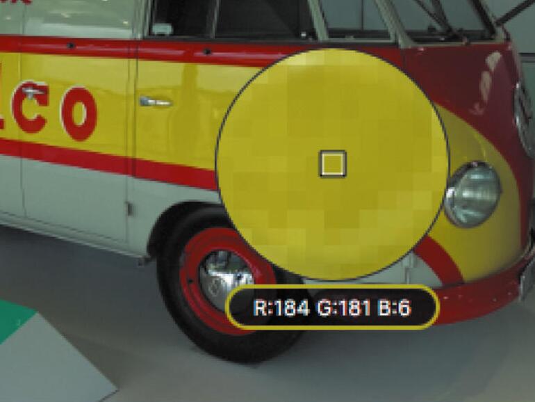 Ziehe das Pipettensymbol aus der Farbpalette auf das Bild. Der Mauszeiger wird zu einer Lupe – das Quadrat in der Mitte zeigt die Farbe, die du wählst, wenn du die Taste loslässt.