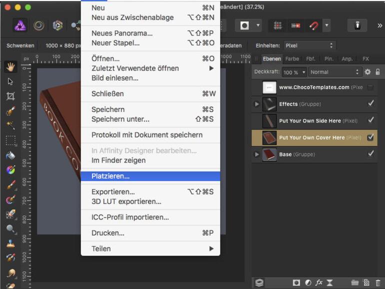 Öffne das gewünschte Mock-up und gehen zum Menü „Datei“, um dort den Befehl „Platzieren“ zu nutzen. Wähle im „Öffnen“-Dialog dein Bild aus und bestätige mit „Okay“.