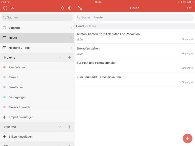 Daneben gibt es aber noch weitere Alternativen im App Store. Wer simple Aufgabenlisten erstellen möchte, greift zum Beispiel zu Todoist. Die App ist kostenfrei im App Store für iPhone, iPad und Mac erhältlich. In der Basisversion sortieren Sie Ihre Aufgaben in verschiedenen Projekten, Labels und Filtern. Todoist liefert eine Tages- und Wochenansicht Ihrer Aufgaben.