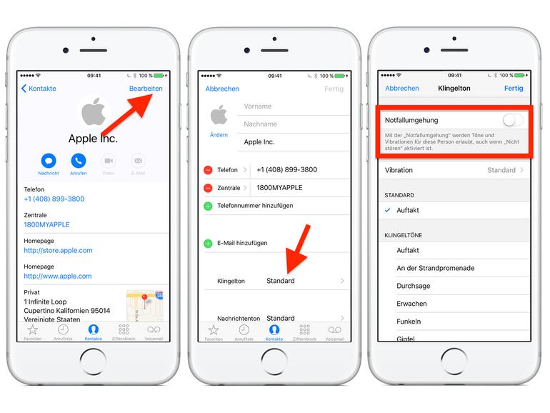 Nehmen Sie zunächst Ihr iPhone zur Hand und öffnen Sie dann die Telefon-App. Tippen Sie danach auf den Reiter „Kontakte“ und wählen nun einen beliebigen Kontakt aus. Oben rechts tippen Sie anschließend auf den Eintrag „Bearbeiten“ Jetzt wählen Sie die Option „Klingelton“ aus.