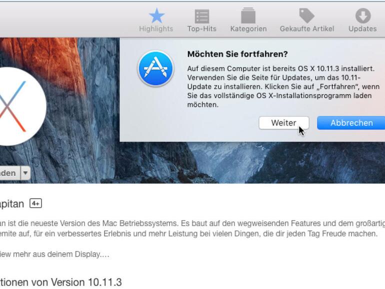 Als Erstes lädst du El Capitan aus dem App Store, falls du keine aktuelle Version auf dem Rechner hast oder OS X sie nach der Installation automatisch gelöscht hat. Der Store weist darauf hin, falls du bereits OS X 10.11 nutzt, was du dann mit „Weiter“ bestätigst. Startet der Installer, beenden ihn.
