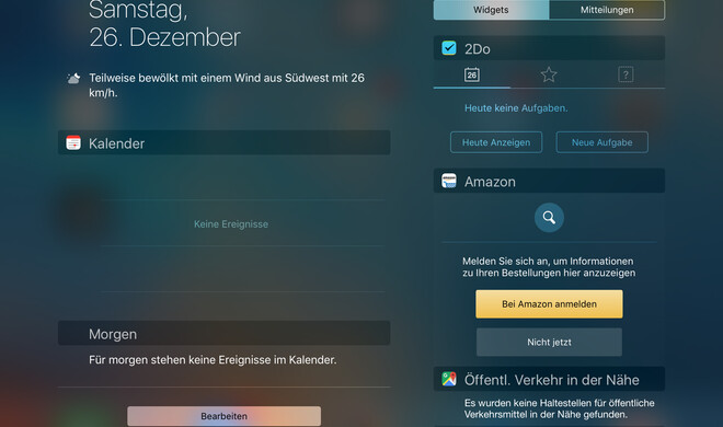 Tipp: Am unteren Ende in „Heute“ findet man einen „Bearbeiten“-Knopf. Tippt man auf diesen, kann man die „Heute“-Ansicht anpassen und verfügbar Widgets weiterer Apps einbinden.