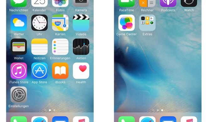 Anders als bei vielen Android-Geräten landest du unter iOS direkt auf dem Homescreen, der alle deine Apps bereithält. Apple hat bereits zahlreiche Apps vorinstalliert, die sich im Übrigen nicht deinstallieren lassen. Des Weiteren kann man auf dem Homescreen eine systemweite Suche starten (Seite 8), auf die Mitteilungszentrale (Seite 5) und das Kontrollzentrum (Seite 6) zugreifen. Nebenbei kann man hier seine Apps nach belieben sortieren und ebenso löschen (Seite 9). Am unteren Rand hat Apple vier Apps positioniert, die auf allen weiteren Homescreen-Seiten angezeigt werden. Diese sind aber austauschbar.