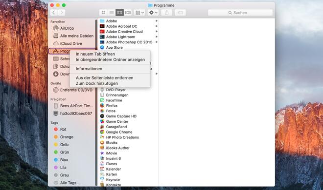 Die Verwaltung von Dokumenten, Downloads und anderen Daten übernimmt der Finder. Er ist also wie der Explorer unter Windows. Am linken Rand werden die wichtigsten Ordner eingeblendet und ebenso kann man von hier aus auf den Cloud-Speicher zugreifen, sofern man denn eine Apple-ID eingerichtet hat.