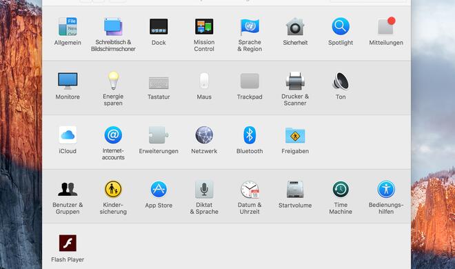 Über das Apple-Logo am oberen Bildschirmrand kommt man jederzeit schnell in die Systemeinstellungen. In dem Menü lassen sich sämtliche wichtigen und systemrelevanten Einstellungen und Verhaltensweisen vornehmen. So lassen sich beispielsweise Animationen abschalten, die Auflösung ändern, die Suchfunktion anpassen oder Multi-Touch-Gesten über den Menüpunkt „Trackpad“ einsehen und aktivieren.