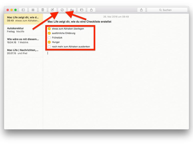 Du kannst deine erstellten Checklisten auch ganz einfach ausdrucken - Drucker und genügend Farbe vorausgesetzt. Um die Checkliste zu drucken, gehst du in die Menüleiste am oberen Bildschirmrand und wählst den Punkt "Ablage" aus. Dort siehst du den Unterpunkt "Drucken". Klicke darauf und bestätige im nächsten Fenster mit Klick "Drucken". Alternativ kannst du auch die Tastenkombination Command-Taste (cmd) + P drücken.
