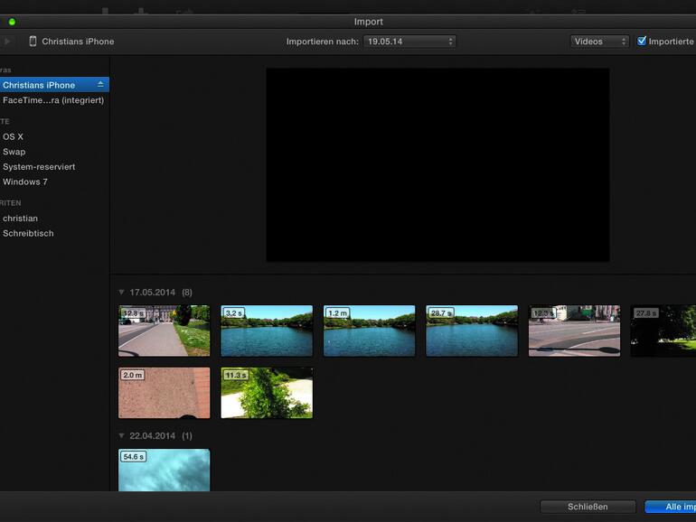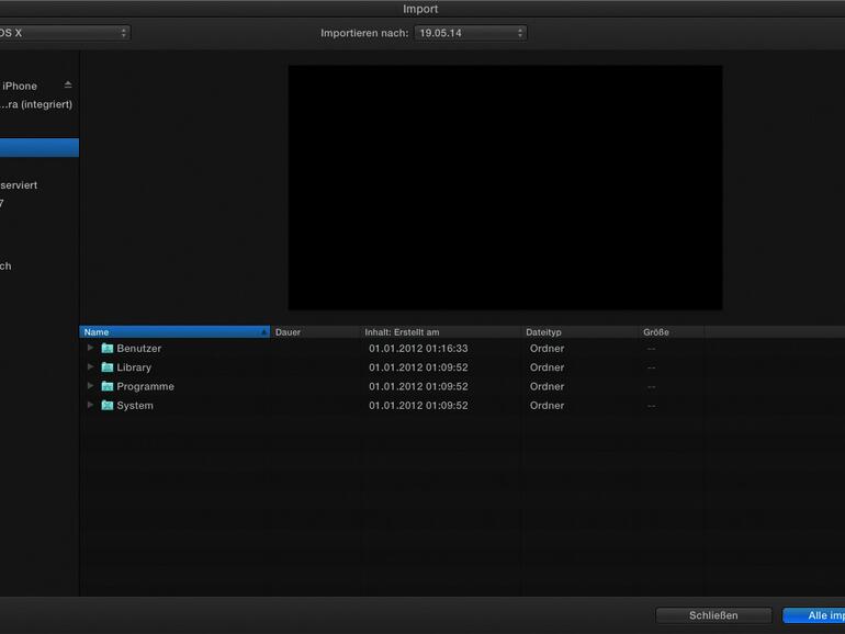 Dieser listet alle gefundenen Ordner und Dateien auf, welche nach verschiedenen Kriterien wie Namenoder Datum sortiert werden können. Darüber befindet sich das Vorschaufenster. Sobald Sie einen Videoclip auswählen, können Sie sich hier die gewählte Datei anschauen, bevor Sie sich für den Import entscheiden. Dies hat den großen Vorteil, dass ungewollte oder misslungene Aufnahmen gleich aussortiert werden können und dadurch später die Ordnung bei der Bearbeitung gewahrt bleibt. Wählen Sie nun die gewünschten Videoclips von Ihrem Gerät aus. Am einfachsten geht dies, indem Sie die Taste [cmd] gedrückt halten und die gewünschten Dateien mit einem Klick anwählen. Sind Sie mit der Auswahl fertig, klicken Sie auf Importieren.