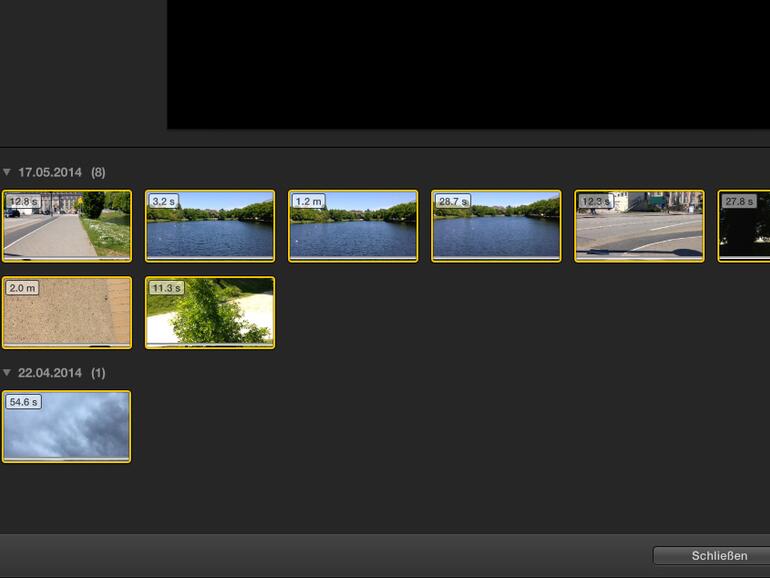 Videos in die Timeline einfügen I: Um damit zu beginnen, Ihre Videodateien zu bearbeiten, müssen Sie diese erst in die Zeitleiste in der unteren Hälfte des Programmfensters befördern. Wählen Sie dazu mit gehaltener cmd- Taste + Mausklick entweder eine oder mehrere Dateien aus Ihrem Ereignis aus.