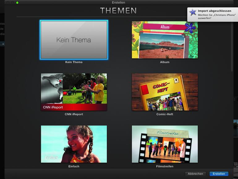 Nun erstellen Sie Ihren ersten Film. Dazu klicken Sie im oberen Bereich auf den Punkt „Erstellen“ und wählen den Punkt „Film“ aus. Es öffnet sich daraufhin ein Fenster mit einer Auswahl von verschiedenen Themen. So können Sie Ihren fertigen Film später aussehen lassen wie ein Comic-Heft, ein Foto-Album oder eine Nachrichtensendung. Für unseren Grundkurs ist es am besten, die Vorlage „Kein Thema“ zu wählen. Dadurch haben Sie später volle Handlungsfreiheit, was Übergänge zwischen Sequenzen und Titel betrifft. Nach der Sie diese mit einem Klick auf „Erstellen“. Das Fenster schließt sich und ein leeres Projekt ist erstellt. Das Programmfenster von iMovie hat sich in diesem Schritt ein wenig verändert. Links finden wir immer noch die verschiedenen Ereignisse. Direkt darunter gibt es nun aber noch einem Bereich mit dem Namen Inhaltsmediathek, der Übergänge, Titel und Musikstücke enthält. Diesen erklären wir Ihnen im Verlauf des Kurses noch näher.