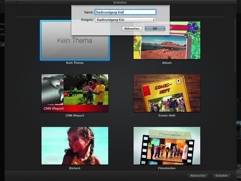 Ein Filmprojekt erstellen: Um ein neues Projekt für Ihren Film zu erstellen, klicken Sie auf die Schalfläche „Erstellen“. iMovie fragt nun nach, ob es ein Film oder ein Trailer werden soll. Klicken Sie an dieser Stelle auf „Film“. Ein neues Fenster öffnet sich und führt Sie durch die weiteren Schritte.