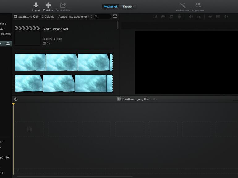 Ergebnisüberprüfung: Nach der Namensvergabe ist die Erstellung fast komplett. iMovie springt selbst zur Hauptoberfläche zurück und sollte automatisch auf das passende Ereignis springen und alle importierten Filme, Musikdateien etc. anzeigen. Im obersten Bereich steht der Name Ihres Filmprojektes.