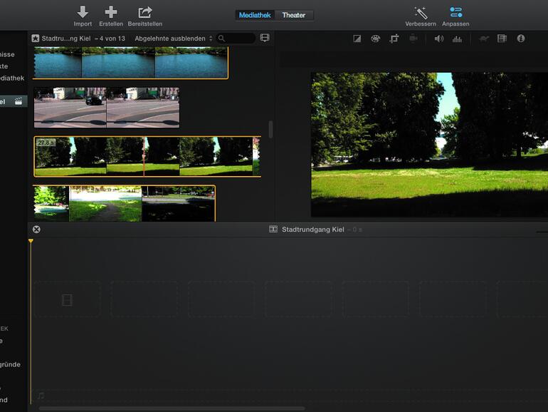 Der nächste Schritt besteht darin, die einzelnen Szenen in die Zeitleiste einzufügen und zu arrangieren. Dazu wählen Sie zuerst aus Ihrer Mediathek auf der linken Seite ein Ereignis aus. Danach markieren Sie bei gedrückt gehaltener [cmd]-Taste mit einem Klick mit der Maustaste auf den jeweiligen Videoclip entweder eine oder mehrere Dateien. Möchten Sie nur einen bestimmten Teil einer Filmsequenz verwenden, so können Sie auch folgendermaßen vorgehen: Suchen Sie die Datei im Ereignis heraus und markieren Sie mit gedrückt gehaltener Maustaste den Teil, den Sie in die Zeitleiste kopieren möchten. Sind Sie mit der Auswahl zufrieden, klicken Sie auf das kleine Plus, das auf der Auswahl erscheint. Damit wird diese Sequenz nach unten in die Zeitleiste kopiert. Nun haben Sie die erste, grobe Version Ihres Films vor sich. Gehen Sie nun mit dem Mauszeiger entweder auf das Vorschaufenster oben rechts oder drücken Sie die Leertaste. Damit wird eine Wiedergabe des Inhalts der Zeitleiste veranlasst. So können Sie sich davon überzeugen, dass die eingefügten Szenen in der richtigen Reihenfolge sind.