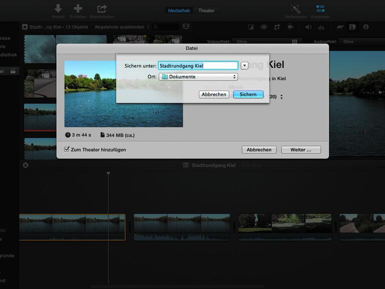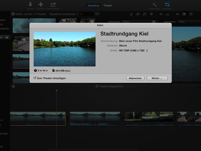 Wählen Sie hingegen „Datei“ aus, können Sie den Speicherort selbst festlegen. Der Film wird dann auch nicht automatisch in iTunes eingefügt. Besonders interessant für iOS-Nutzer ist die Funktion, den Film über den Punkt „Theater“ bereitzustellen. Hierbei wird dieser in die iCloud hochgeladen und auf allen Geräten synchron gehalten. So können Sie Ihr Urlaubsvideo daheim schneiden, in der iCloud speichern und unterwegs bei Freunden abspielen. Für Nutzer, die Ihre Filme gern online präsentieren möchten, stehen weiterhin die Optionen „Vimeo“ und „YouTube“ zur Verfügung.