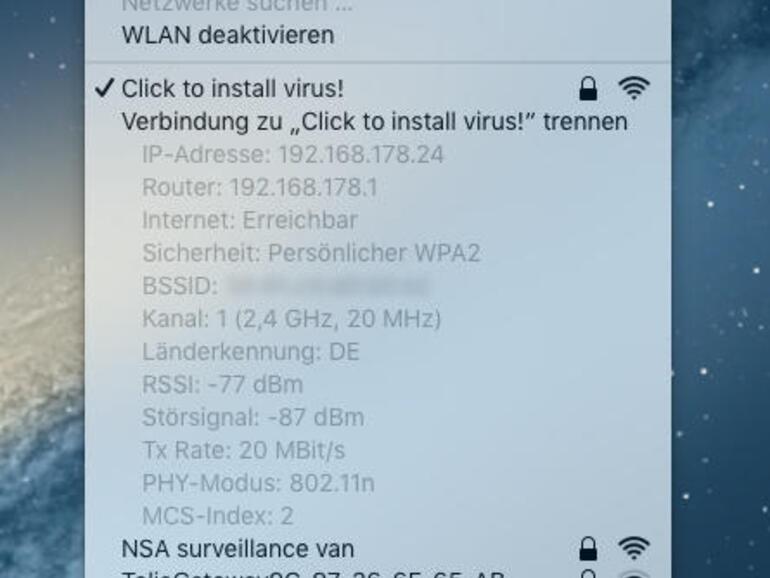 Ermittel zunächst deine aktuelle Transferrate. Dazu hältst du die Wahltaste [alt] gedrückt und klickst auf das WLAN-Symbol in der Menüleiste. Den Wert liest du unter dem Eintrag „Tx Rate“ ab.