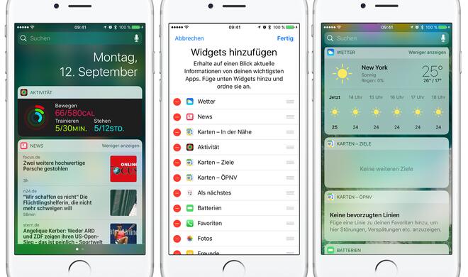 Sowohl im Sperrbildschirm als auch auf dem Home-Bildschirm findet man die Widgets, wenn man von links nach rechts wischt. Diese sind nun vollkommen anpassbar, sodass auch die Siri-Vorschläge deaktiviert werden können. Zusätzlich hat Apple iOS 10 zahlreiche neue Widgets spendiert, die nach Belieben geordnet werden können. Befindet man sich in einer App, dann sind die Widgets nach wie vor über die Mitteilungszentrale abrufbar.