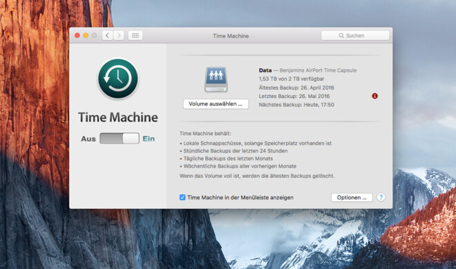 Vor der Installation der Beta sollten Sie via Time Machine ein Backup auf einem externen Speichermedium erstellen. Klicken Sie dazu dazu in der Menüleiste oben rechts auf das Time-Machine-Icon und wählen „Backup jetzt erstellen“ aus. Je nach zu sichernder Datenmenge und Verbindung zum Speichermedium kann das Backup längere Zeit in Anspruch nehmen. Sollten Sie noch kein Backup-Volumen angelegt haben, dann folgen Sie unserem kurzen Guide.