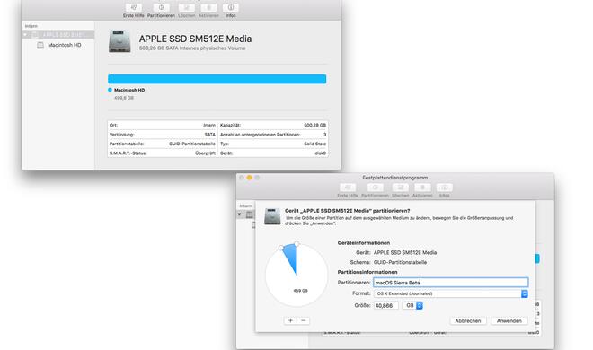 Rund drei Monate testete Apple macOS Sierra in der offiziellen Betaphase. Zwar konnte man viele Fehler beheben aber nicht alle. Wer das System vor der Installation auf dem Alltags-Mac testen möchte, kann dies ganz einfach tun. Nutzen Sie dafür ein Zweitgerät oder partitionieren Ihre Festplatte, sodass macOS Sierra parallel zu OS X 10.11 El Capitan installiert wird. Öffnen Sie dazu „Programme“ „Dienstprogramme“ „Festplattendienstprogramm“ und wählen Ihre Festplatte oder SSD aus. Klicken Sie anschließend auf „Partitionieren“ und dann auf das „+“ unter dem Kreisdiagramm. Geben Sie für die neue Partition einen Namen ein und stellen ihr mindestens 20 GB zur Verfügung. Klicken Sie nun auf „Anwenden“, um die neue Partition zu erstellen.
