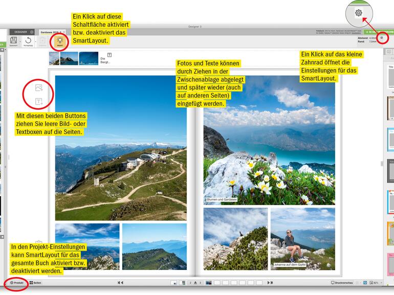 SmartLayout steht Ihnen jederzeit zur Verfügung: Ob Sie Ihr Projekt mit leeren Buchseiten beginnen oder den innovativen Assistenten (siehe dazu Teil 1 unserer Workshop-Serie) nutzen: Nach allen Veränderungen, die Sie vornehmen, sieht die Buchseite stets professionell gestaltet aus. SmartLayout passt die anderen Elemente auf der Seite so an, dass jederzeit ein ausgewogenes Layout entsteht. Selbst ein Formatwechsel des Buches (zum Beispiel vom Hochformat zum Querformat) können Sie durchführen. SmartLayout wird die Fotos wieder perfekt anordnen. Lassen Sie Ihrer Kreativität ohne Angst vor Fehlern freien Lauf. Alle Schritte können mit einem Klick rückgängig gemacht werden. SmartLayout schränkt Ihre kreative Freiheit übrigens nicht ein: Wollen Sie zum Beispiel komplett frei gestalten, können Sie SmartLayout mit einem Klick deaktivieren – aber wer möchte schon freiwillig darauf verzichten.