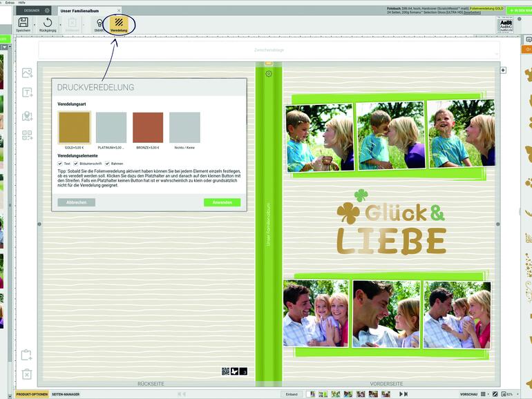 Ebenfalls neu ist die optional angebotene Folienveredelung in Gold, Platin oder Bronze. Dabei kann der Anwender mit einem Klick entscheiden, welche Elemente, Rahmen, Sticker oder Schriften (in einem zusätzlichen Schritt nach dem Druck) individuell veredelt werden sollen.