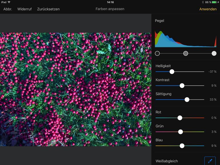 Doch in der Mehrzahl der Fälle spielen derartige Probleme keine große Rolle, denn oftmals stammen die Bilder vom iPhone oder anderen, eher niedrig auflösenden Kameras und lassen sich prima bearbeiten, was auch für die bei besseren Kameras beliebten Raw-Formate gilt, die mehr Reserven beinhalten als JPEG-Dateien. Eine wichtige Einschränkung für die Bildbearbeitung unter iOS ist die etwas unpräzisere Fingerbedienung, die das Arbeiten auf Pixelebene fast unmöglich macht. Nur auf dem iPad Pro hat man mit dem Stift ähnliche Möglichkeiten wie mit einem Grafiktablet auf dem Rechner. Das spielt beispielsweise bei Gradationskorrekturen keine Rolle, bei kleinteiligen Änderungen helfen oft automatische Funktionen.