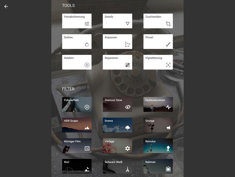Streicht man seitlich über das Bild, wechselt man zwischen den Reglern, streicht man hoch und runter, regelt man den betreffenden Punkt. Der „Zauberstab“ bemüht sich, Belichtung und Farbe automatisch zu regeln. Dazu verstellt er die einzelnen Regler individuell und ist oft ein guter Startpunkt für die manuelle Verbesserung. Beeindruckend und oft übersehen sind auch die Regler für die Schwarzweißkonvertierung, denn hier lässt sich nicht nur die Grauwertverteilung einstellen, sondern auch sehr gut wirkendes Filmkorn hinzufügen. Eher Geschmacksache sind sicherlich die diversen Filter zur Verfremdung von Bildern, zumal dieser Punkt von vielen Drittanbieter-Apps dann doch besser beherrscht wird.