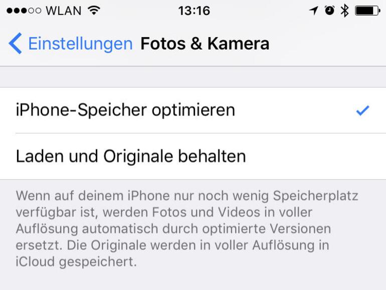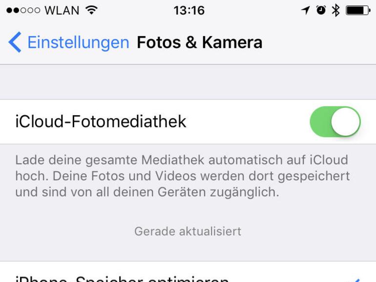 Als zweite Möglichkeit können Sie die iCloud-Fotomediathek aktivieren. Dadurch werden alle Fotos, auch die bereits vorhandenen, auf den iCloud-Server geladen. Es gibt keine Beschränkungen für Anzahl und Zeitdauer, sodass Sie ein vollständiges Backup Ihrer Fotos erhalten. Der zweite große Vorteil: Alle mit der iCloud-ID und der Fotomediathek verbundenen Geräte synchronisieren Ihre Sammlungen vollständig, auch wenn Sie sie nur gelegentlich zur Hand nehmen. Um auf den Geräten lokalen Speicherplatz zu sparen, kann iOS die Auflösung heruntergeladener Bilder reduzieren.