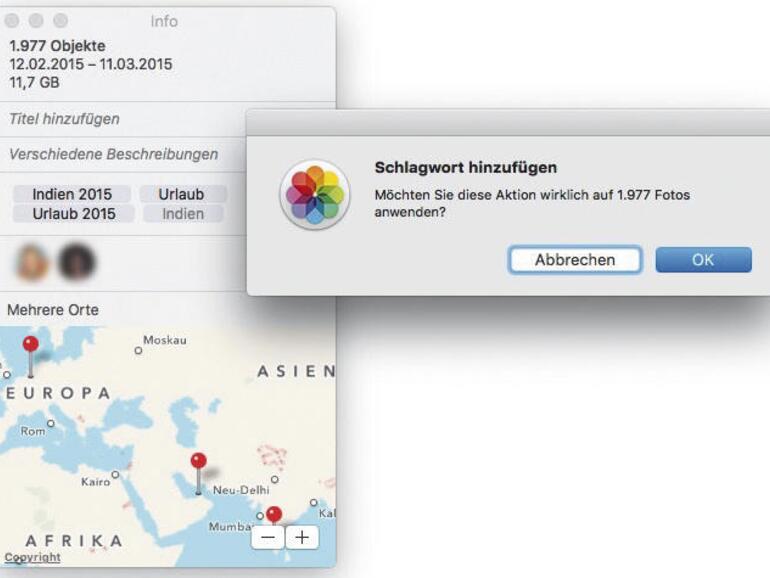 Bei der Sortierung mit intelligenten Alben und Ordnern wird schnell klar, dass der viel gerügte Wegfall der „Ereignisse“ aus iPhoto unter Fotos durch eine neuere, mächtigere Funktion ersetzt wurde: Die Verschlagwortung und Betitelung von Bildern erlaubt nämlich, dass diese in mehreren intelligenten Alben auftauchen und erlaubt so eine deutlich präzisere und übersichtlichere Sortierung. Wenn zum Beispiel ein Bild nicht nur zum Ereignis „Urlaub 2015“ zuzuordnen ist, sondern auch „leckeres Essen“ zeigt, müssen Sie die Bilder nur mit beiden Schlagworten versehen und für jedes Schlagwort ein intelligentes Album erstellen. Schon haben Sie alle Bilder die den Urlaub zeigen, in einem eigenen Album, sondern auch die, die „leckeres Essen“ abbilden. Da Sie beliebig viele Schlagworte vergeben können, kann jedes Bild auch in beliebig vielen virtuellen Ereignissen auftauchen – was die Organisation und Suche deutlich erleichtert.