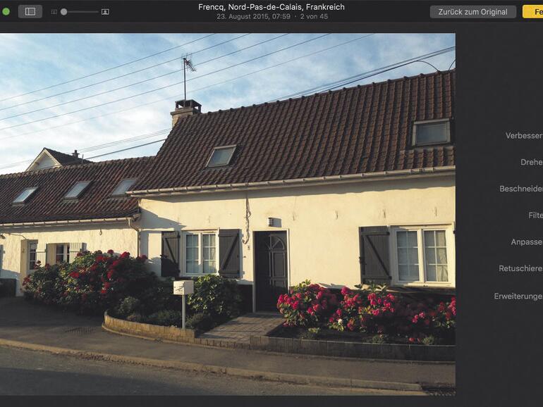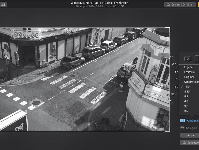 Manchmal ist es wichtig, dass Fotos im richtigen Seitenverhältnis gecroppt werden, etwa wenn sie auf einer Grußkarte oder im Web verwendet werden sollen. Dafür müssen Sie keine zusätzliche Bildbearbeitung bemühen: Öffnen Sie das Foto einfach im Bearbeitungs-Dialog von Fotos und wählen Sie hier „Beschneiden“. Unten im Beschneiden-Dialog finden Sie die mit dem Menü „Verhältnis“ die Möglichkeit, bestimmte Kantenverhältnisse zu verwenden, etwa „16:9“, um das Bild passend als Hintergrundbild für einen modernen Monitor zu erstellen. Oder Sie geben manuell „16:10“ ein, um das Kantenverhältnis von iMacs und Macbooks zu erhalten. Anschließend können Sie das Bild im festgesetzten Rahmen zurechtschieben und mit „Fertig“ speichern.