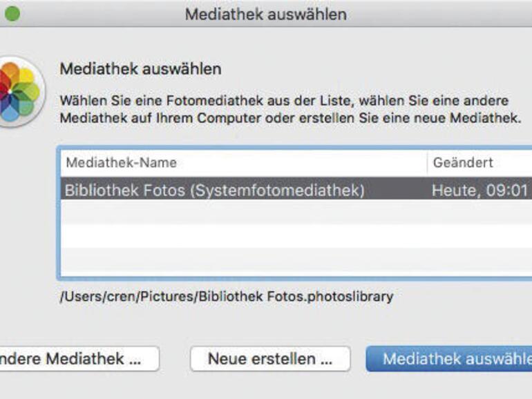 Manchmal kann es sinnvoll sein, mehrere Fotos-Mediatheken zu verwenden, etwa weil Sie privates und berufliches Bildmaterial getrennt pflegen möchten oder weil Sie eine „große“ Mediathek zuhause auf einer externen Festplatte einsetzen und nur eine „Schrumpfversion“ auf dem Macbook. So oder so ist es ganz einfach, mehrere Mediatheken zu erstellen und zwischen ihnen zu wechseln: Öffnen Sie Fotos einfach mit gedrückter (alt)-Taste: Ein Auswahlmenü erscheint, in dem Sie nicht nur neue Mediatheken erstellen, sondern auch andere auswählen können.
