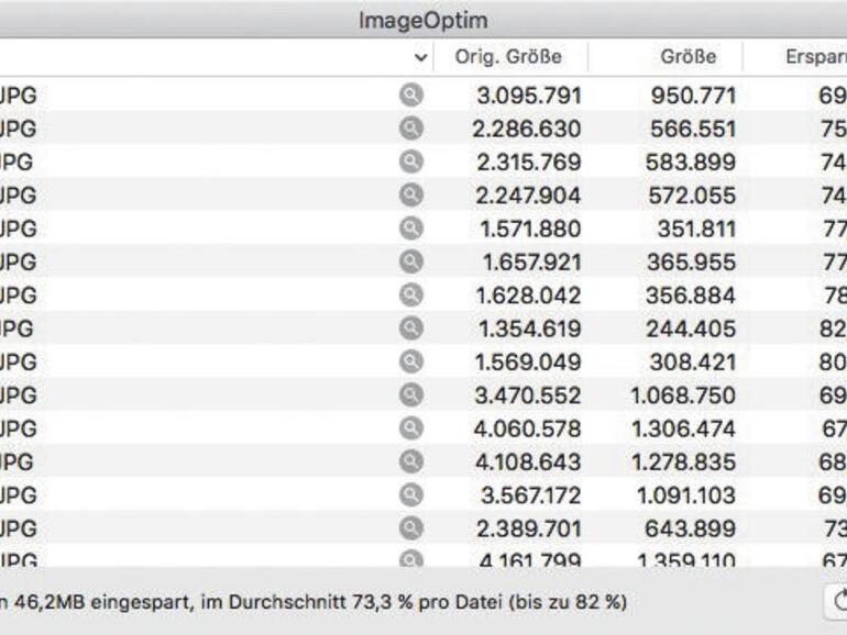 Dieser Tipp ist kein direkter Fotos-Tipp, sondern funktioniert mit jedem Bild: Wenn Sie die Dateigröße für den Einsatz im Web maximal reduzieren möchten, ohne dabei auf Bildqualität zu verzichten, sollten Sie einen Blick auf das kostenlose Tool ImageOptim werfen: Dieses entfernt alle unnötigen Informationen aus Bilddateien, ohne das JPEG unnötig kleinzurechnen, was an Speicherplatz und Ladezeit im Web sparen kann. Zusätzlich erlaubt das kleine Programm aber auch die Umrechnung der Bilder in eine geringere JPEG-Qualität, wie im Screenshot gezeigt. Hier lassen sich enorme Einsparungen in Sachen Dateigröße erzielen.