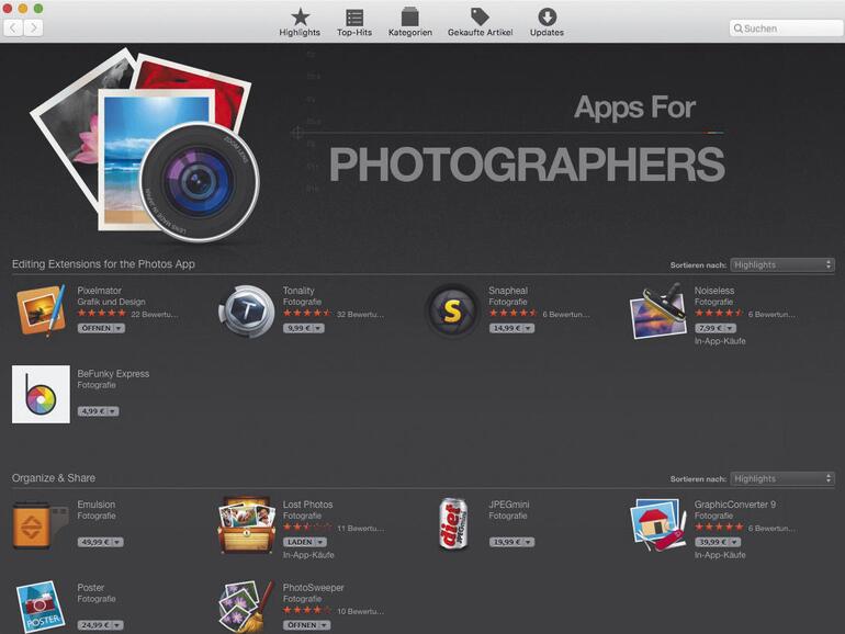 Es gibt nicht viel, was bei Fotos besser wäre als beim alten iPhoto, einen Vorteil gibt es aber doch: Die Fotos-App besitzt eine leistungsfähige Plugin-Schnittstelle, die ohne Umwege direkt von Apps benutzt werden kann. Alles, was Sie dafür tun müssen, ist ein Programm mit entsprechenden Erweiterungen – etwa Pixelmator (6) – im Mac AppStore zu erwerben und anschließend im Bearbeitungs-Modus der Fotos-App auf den Punkt „Erweiterungen“ klicken. Hier werden vorhandene Erweiterungen automatisch eingepflegt, im Fall von Pixelmator das Tool „Distort“, mit dem Sie Bilder bizarr verdrehen und verformen können. Zusätzliche Apps, die entsprechende Funktionen besitzen, pflegt Apple auf einer eigenen AppStore-Seite (7). Leider gibt es derzeit im Netz noch keine Extensions für Fotos.
