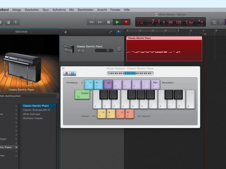 Darunter finden Sie weitere virtuelle Instrumente. Tippen Sie [cmd]+[K] und geben Sie über die virtuelle Tastatur Töne ein. Zum Aufzeichnen klicken Sie den roten Schalter.