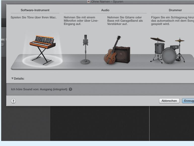 Klicken Sie Software-Instrument und Erzeugen. Die übrigen Optionen stehen für die Nutzung von Mikrofon, Gitarre, Keyboard oder einem virtuellen Schlagzeug (Drummer).