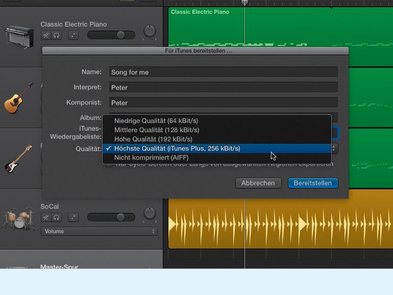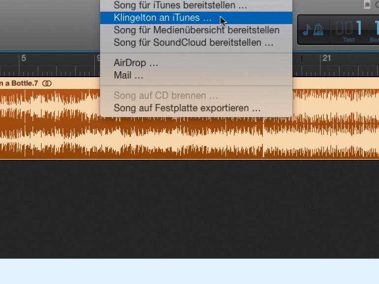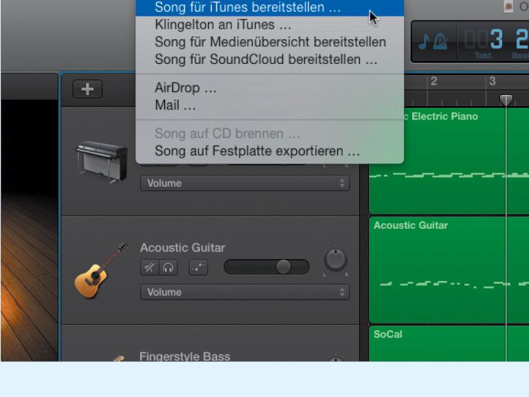 Sind Sie zufrieden, können Sie Ihr Stück an iTunes senden und etwa in Ihr iPhone übertragen. Wählen Sie im Menü Bereitstellen den Eintrag Song für iTunes bereitstellen.