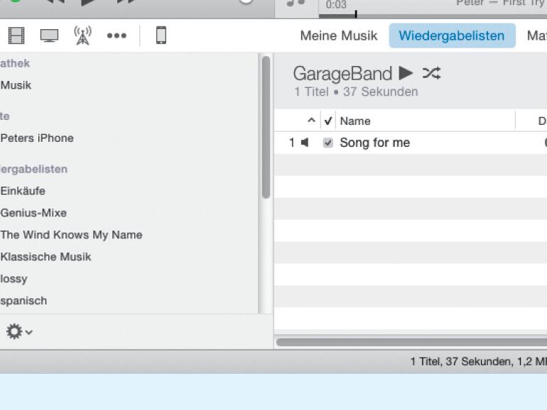 iTunes startet autormatisch und spielt Ihren frisch erstellten Song ab. Diesen finden Sie unter allen Musiktiteln und in der automatisch angelegten Wiedergabeliste „GarageBand“.