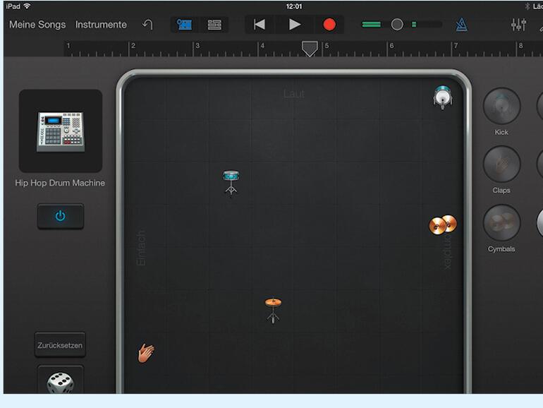 Das Instrument Smart Drums öffnet eine Drum-Machine. Ein Tipp startet einen zufälligen Rhythmus. Diesen ändern Sie durch Verschieben der Symbole in der Displaymitte.